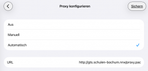- Bevor du Zugriff auf das Internet hast, musst du in den WLAN-Einstellungen den „Proxy“ auf „Automatisch“ setzen und ggf. die URL „https://gts.schulen-bochum.nrw/proxy.pac“ hinterlegen.